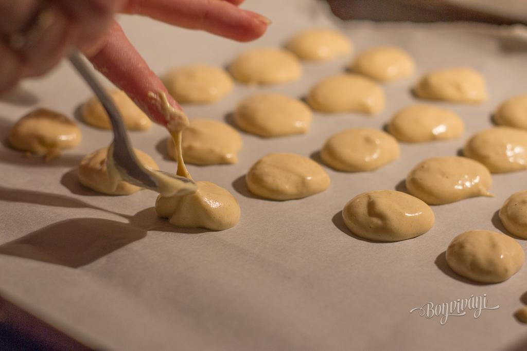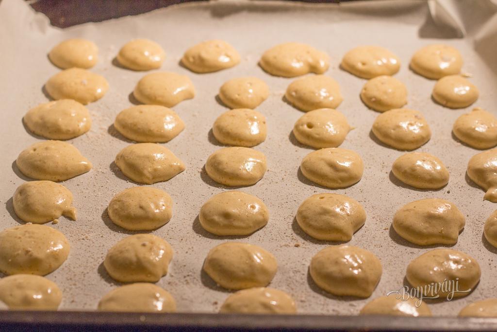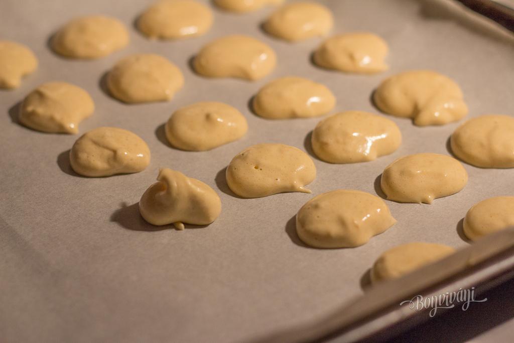 Do tuhého snehu zamiešavame opatrne postupne po lyžiciach múku. Na plech vyložený papierom na pečenie lyžičkou porcujeme malé kopčeky piškótov. Ešte zľahka pocukrujeme cukrom, ktorý sme si odložili na začiatku a pár minút piškóty necháme obschnúť, aby sa nám moc pri pečení nerozliezali. Pečieme vo vyhriatej rúre na 170 až 180 stupňov asi 10 minút.